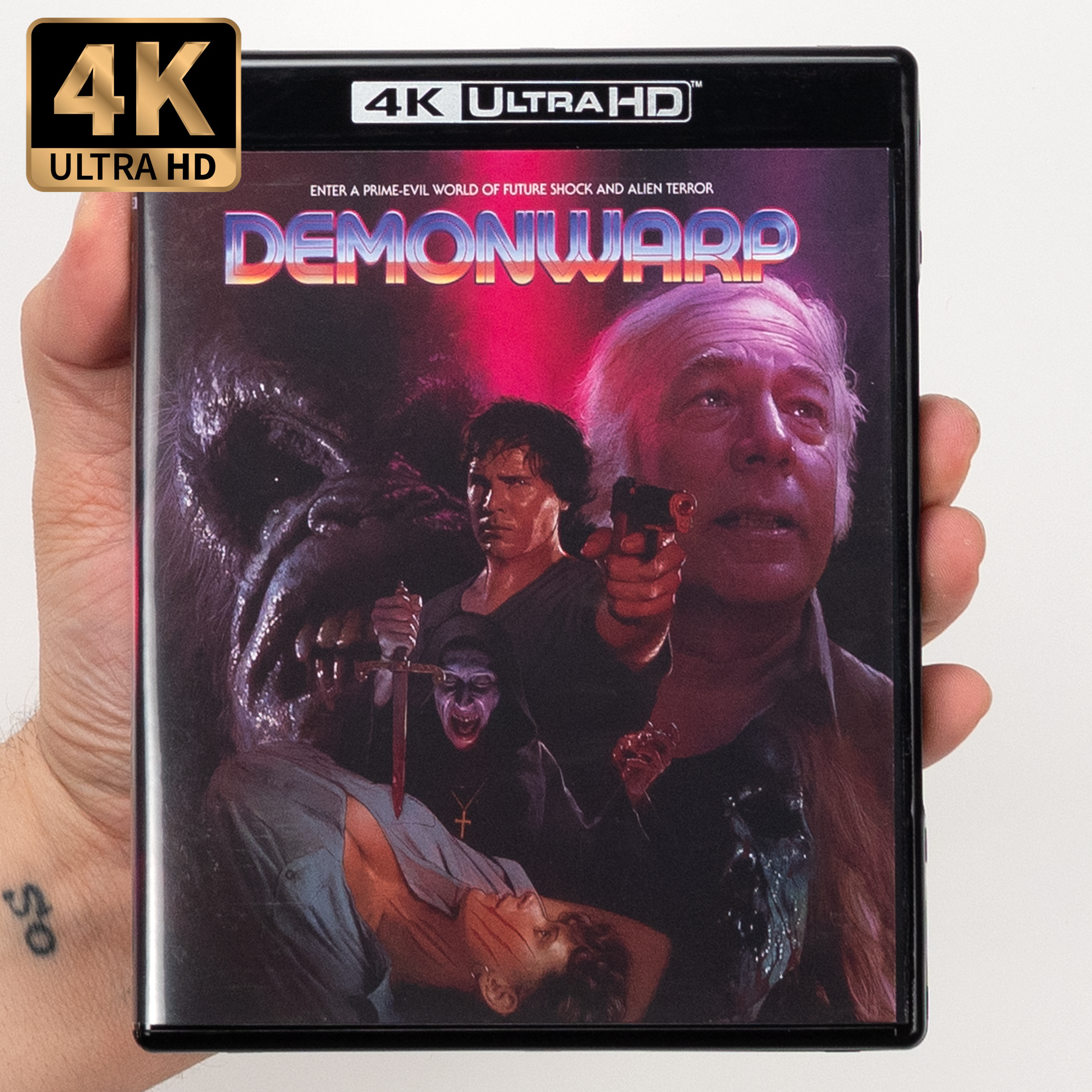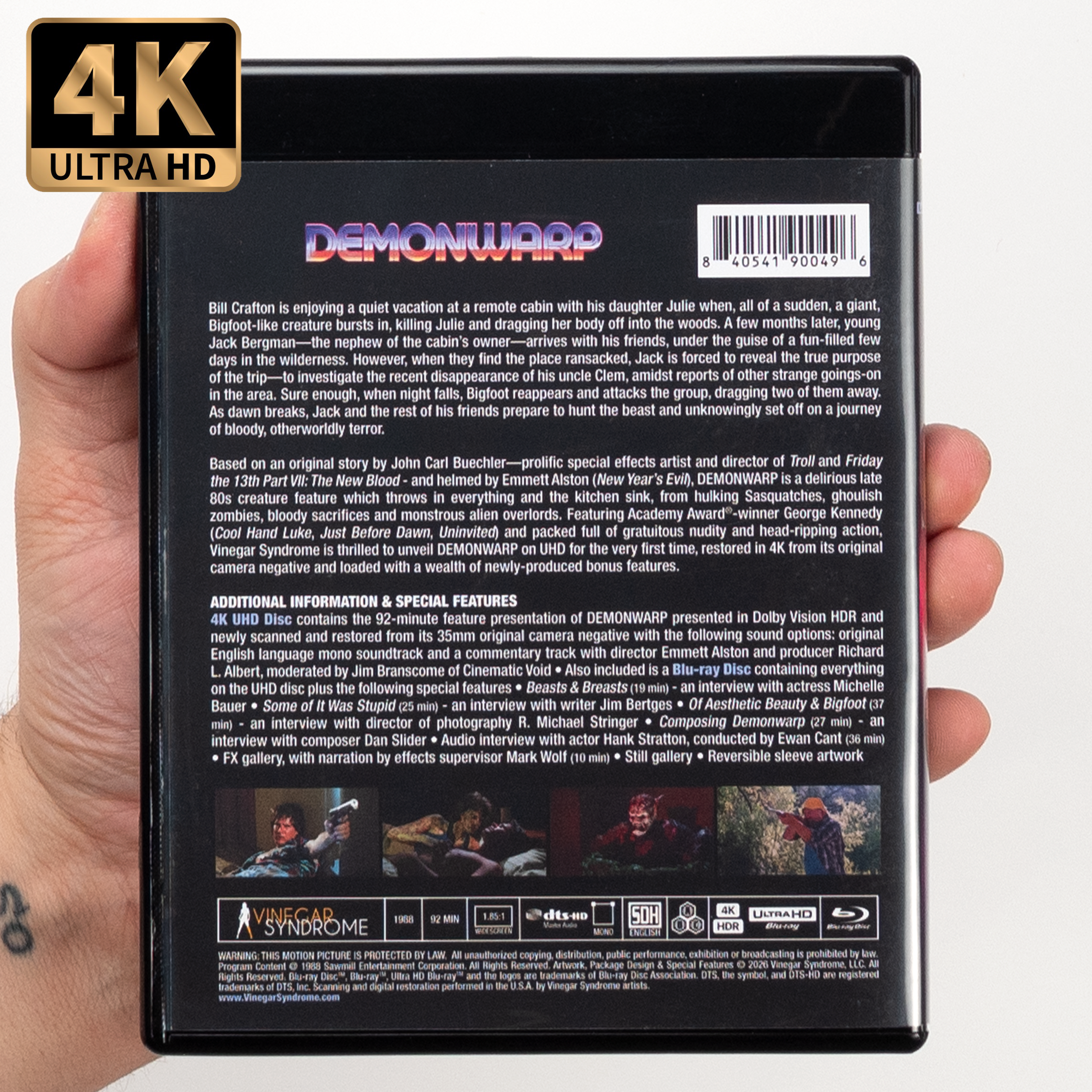 Based on an original story by John Carl Buechler - prolific special effects artist and director of Troll and Friday the 13th Part VII: The New Blood - and helmed by Emmett Alston (New Year’s Evil), DEMONWARP is a delirious late 80s creature feature which throws in everything and the kitchen sink, from hulking Sasquatches, ghoulish zombies, bloody sacrifices and monstrous alien overlords. Featuring Academy Award-winner George Kennedy (Cool Hand Luke, Just Before Dawn, Uninvited) and packed full of gratuitous nudity and head-ripping action, Vinegar Syndrome is thrilled to unveil DEMONWARP on UHD for the very first time, restored in 4K from its original camera negative and loaded with a wealth of newly-produced bonus features.
