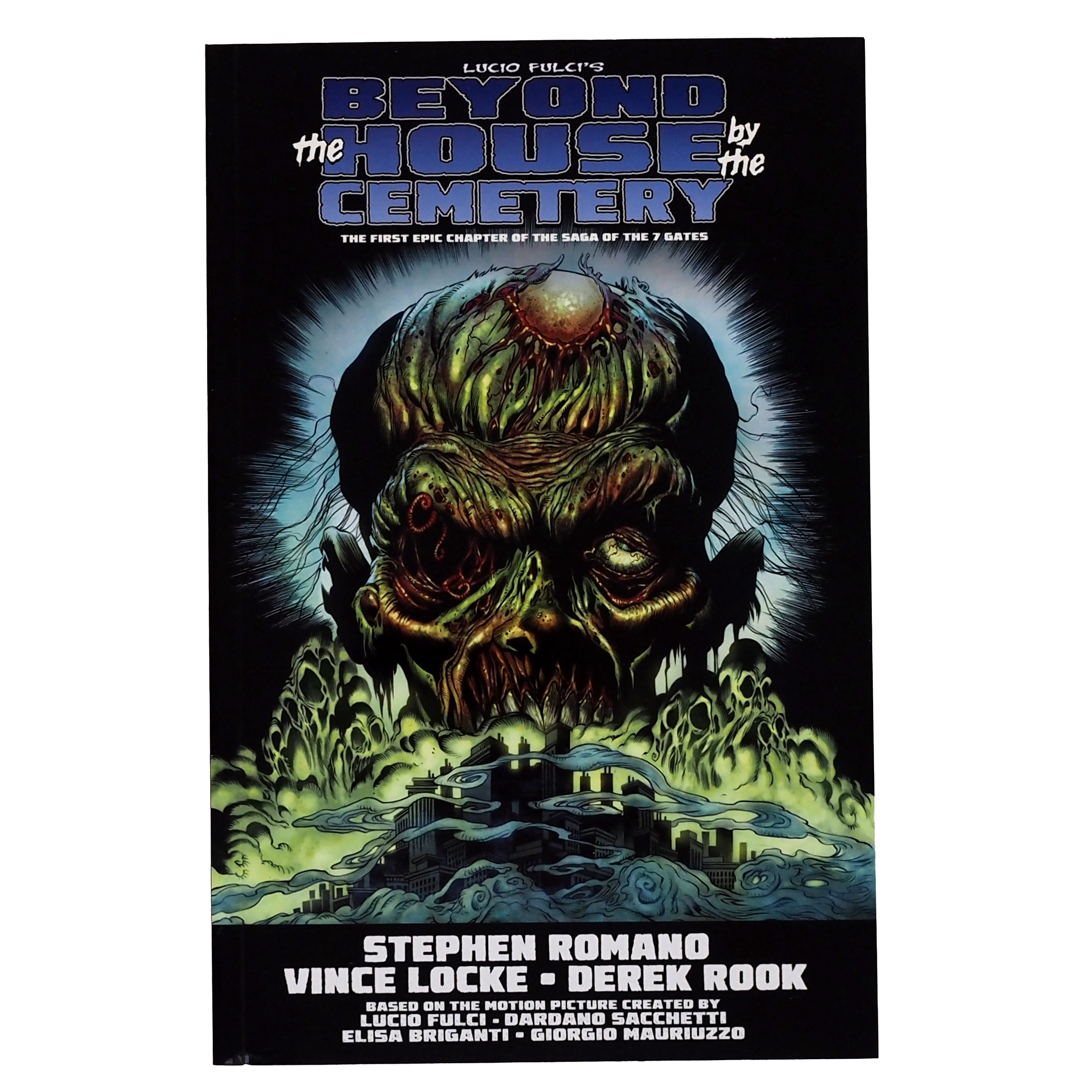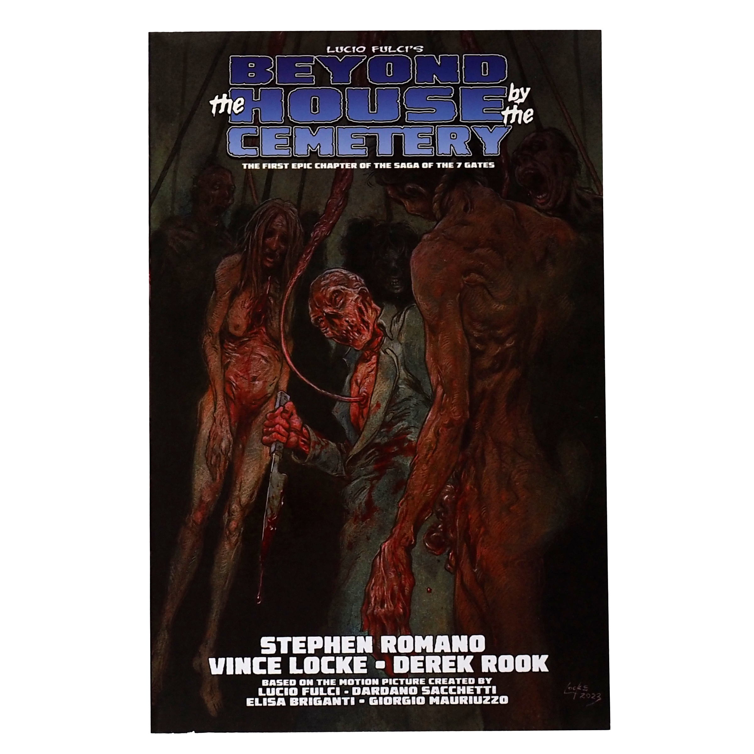 In the early 1980s, legendary director Lucio Fulci began his celebrated "Gates Of Hell Trilogy" with a series of Italian horror films that shocked the world. In 2017, Eibon Press began "The Saga of the 7 Gates," an epic series of comic books based on Fulci's films, hailed by critics and fans alike. Now, just in time for Halloween, comes the first-ever graphic novel collection of the Saga, combining Eibon's acclaimed adaptation of "The House By The Cemetery" with more than ONE HUNDRED BONUS PAGES that continue the Saga and set up the final two chapters, also coming soon as graphic novels. BEYOND THE HOUSE BY THE CEMETERY is TWO HUNDRED AND FIFTY PAGES of never-before-collected horror mayhem, adapting the films and going far beyond them in an absolutely epic expansion of Fulci's cinematic universe, worthy of the best horror novels ever written. Only 1,500 copies have been produced, in two limited collector's editions, written by acclaimed author STEPHEN ROMANO (MASTERS OF HORROR) and with art by the legendary VINCE LOCKE, co-creator of A HISTORY OF VIOLENCE and DEADWORLD. For die-hard horror fans and followers of Fulci, this is a must-own item.