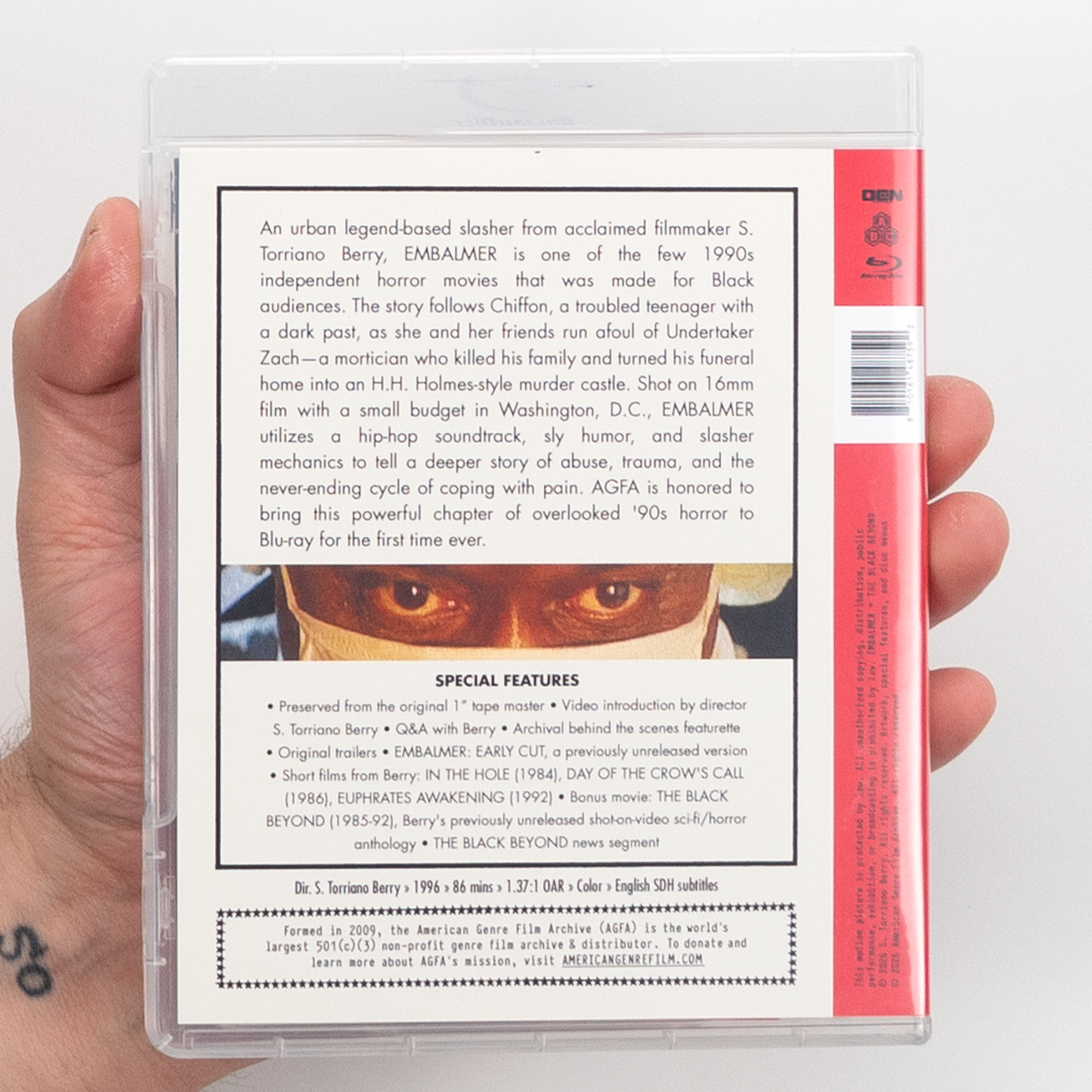An urban legend-based slasher from acclaimed filmmaker S. Torriano Berry, EMBALMER is one of the few 1990s independent horror movies that was made for Black audiences. The story follows Chiffon, a troubled teenager with a dark past, as she and her friends run afoul of Undertaker Zach—a mortician who killed his family and turned his funeral home into an H.H. Holmes-style murder castle. Shot on 16mm film with a small budget in Washington, D.C., EMBALMER utilizes a hip-hop soundtrack, sly humor, and slasher mechanics to tell a deeper story of abuse, trauma, and the never-ending cycle of coping with pain. AGFA is honored to bring this powerful chapter of overlooked '90s horror to Blu-ray for the first time ever.