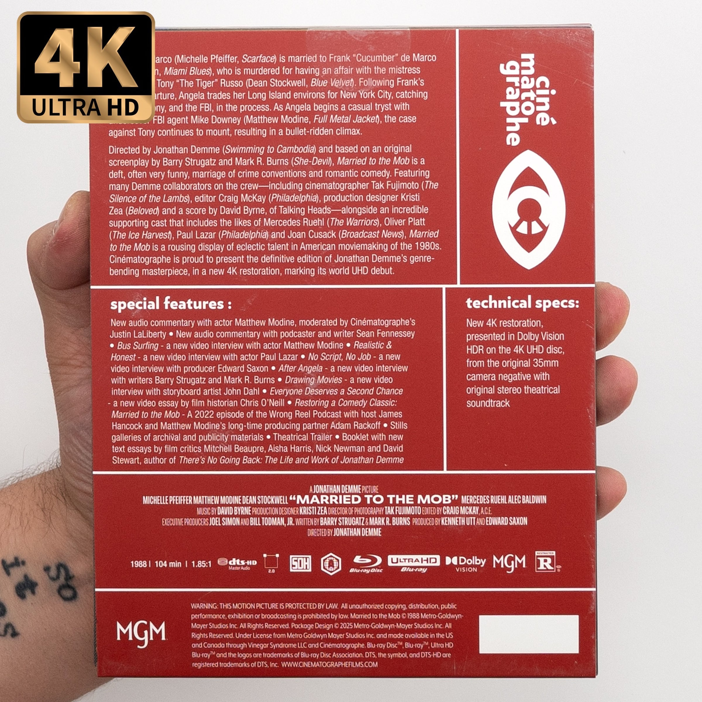 Directed by Jonathan Demme (Swimming to Cambodia) and based on an original screenplay by Barry Strugatz and Mark R. Burns (She-Devil), Married to the Mob is a deft, often very funny, marriage of crime conventions and romantic comedy. Featuring many Demme collaborators on the crew—including cinematographer Tak Fujimoto (The Silence of the Lambs), editor Craig McKay (Philadelphia), production designer Kristi Zea (Beloved) and a score by David Byrne, of Talking Heads—alongside an incredible supporting cast that includes the likes of Mercedes Ruehl (The Warriors), Oliver Platt (The Ice Harvest), Paul Lazar (Philadelphia) and Joan Cusack (Broadcast News), Married to the Mob is a rousing display of eclectic talent in American moviemaking of the 1980s. Cinématographe is proud to present the definitive edition of Jonathan Demme’s genre-bending masterpiece, in a new 4K restoration, marking its world UHD debut.