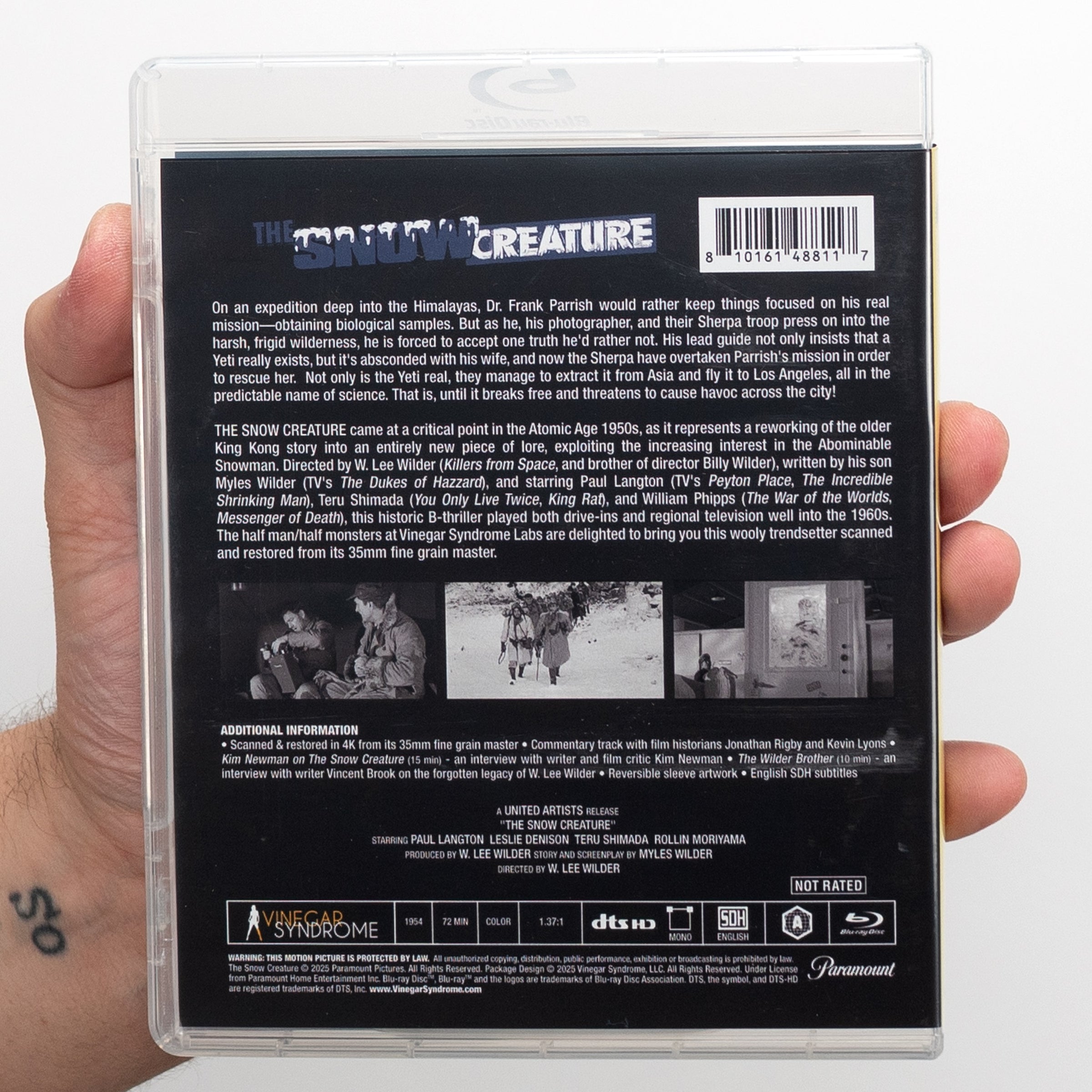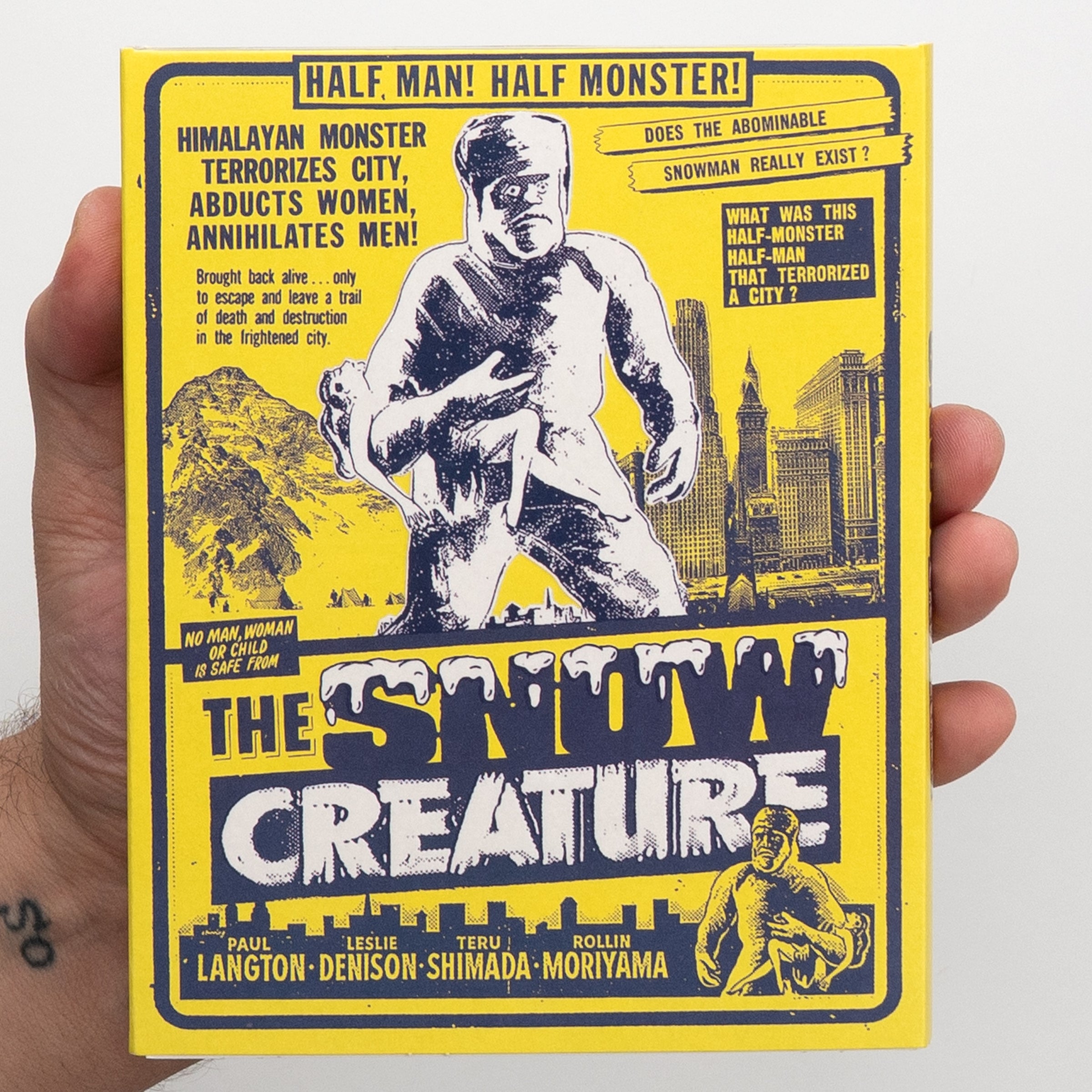 THE SNOW CREATURE came at a critical point in the Atomic Age 1950s, as it represents a reworking of the older King Kong story into an entirely new piece of lore, exploiting the increasing interest in the Abominable Snowman. Directed by W. Lee Wilder (Killers from Space, and brother of director Billy Wilder), written by his son Myles Wilder (TV's The Dukes of Hazzard), and starring Paul Langton (TV's Peyton Place, The Incredible Shrinking Man), Teru Shimada (You Only Live Twice, King Rat), and William Phipps (The War of the Worlds, Messenger of Death), this historic B-thriller played both drive-ins and regional television well into the 1960s. The half man/half monsters at Vinegar Syndrome Labs are delighted to bring you this wooly trendsetter scanned and restored from its 35mm fine grain master.