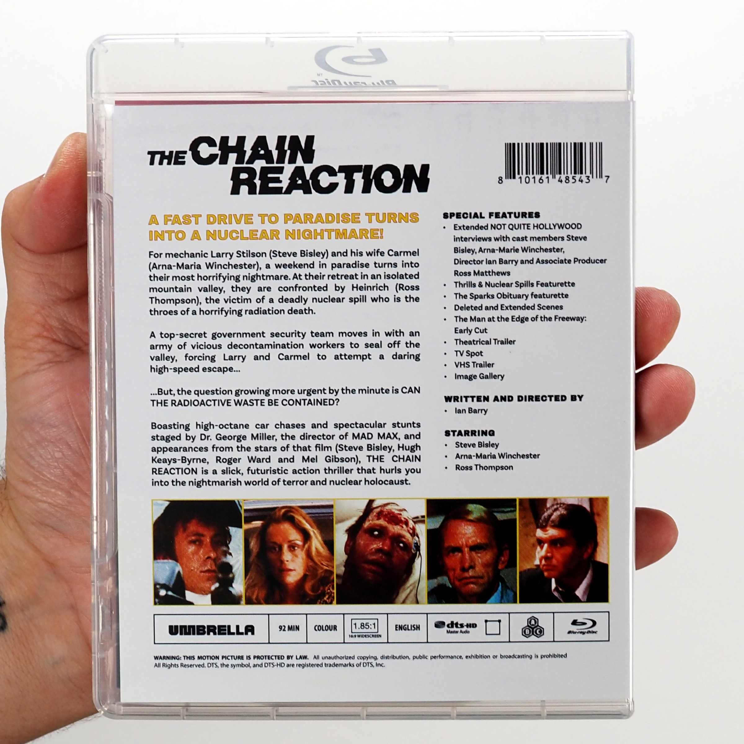 Boasting high-octane car chases and spectacular stunts staged by George Miller, the director of Mad Max, and appearances from the stars of that film (Steve Bisley, Hugh Keays-Byrne and Mel Gibson), The Chain Reaction is a slick, futuristic action thriller that hurls you into the nightmarish world of terror and nuclear holocaust.